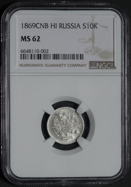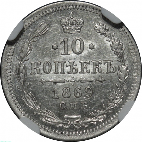 Россия 10 копеек 1869 года СПБ HI В слабе NGC MS 62
